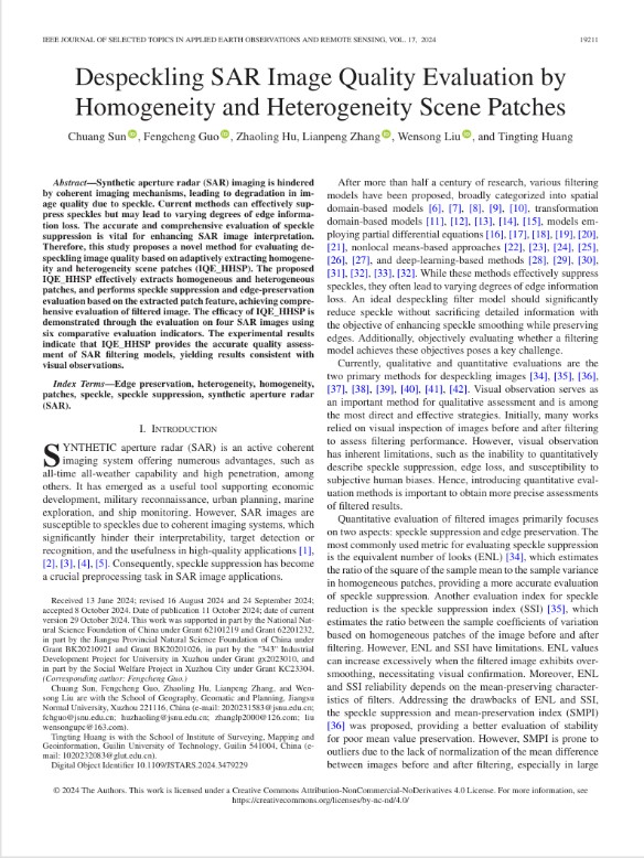Abstract:Synthetic aperture radar (SAR) imaging is hindered by coherent imaging mechanisms, leading to degradation in image quality due to speckle. Current methods can effectively suppress speckles but may lead to varying degrees of edge information loss. The accurate and comprehensive evaluation of speckle suppression is vital for enhancing SAR image interpretation. Therefore, this study proposes a novel method for evaluating despeckling image quality based on adaptively extracting homogeneity and heterogeneity scene patches (IQE_HHSP). The proposed IQE_HHSP effectively extracts homogeneous and heterogeneous patches, and performs speckle suppression and edge-preservation evaluation based on the extracted patch feature, achieving comprehensive evaluation of filtered image. The efficacy of IQE_HHSP is demonstrated through the evaluation on four SAR images using six comparative evaluation indicators. The experimental results indicate that IQE_HHSP provides the accurate quality assessment of SAR filtering models, yielding results consistent with visual observations.