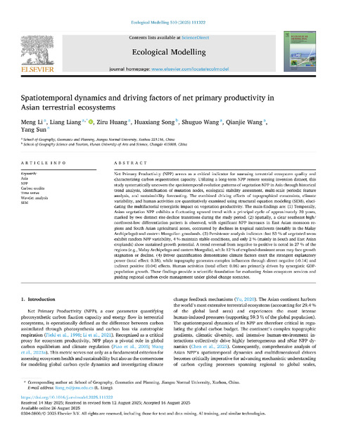 Abstract:Net Primary Productivity (NPP) is a critical measure of ecosystem vitality. This paper examines the spatiotemporal variation in NPP across Africa during 1981–2018 using Theil-Sen slope estimation and wavelet analysis. Sustainable change characteristics in different regions are analyzed using the Hurst exponent, and the influence of driving factors on African NPP are quantified through a structural equation model (SEM). The analysis revealed that: (1) The annual variation curve of African NPP demonstrated a fluctuating upward trajectory (p = 0.001) throughout the study period. Wavelet analysis revealed a cyclical pattern with a primary period of about 20 years, characterized by two upward and downward transitions during 1981–2018. (2) Spatial analysis indicates the distribution of NPP across Africa is centered around the equator and gradually decreases towards higher latitudes, in which the NPP of tropical rainforest and its adjacent areas increases significantly, covering 40.2 % of Africa’s area. However, Hurst exponent analysis reveals that NPP in Africa generally exhibits anti-sustainability changes, with 52.8 % of the total area potentially shifting from growth to decline in the future. (3) SEM analysis shows that NPP in Africa is mainly regulated by natural factors, particularly cumulative precipitation and temperature extremes, which exhibit the highest impact coefficient of 0.89. While topographic factors also have a substantial overall effect, their impact is primarily indirect through climate, with minimal direct influence. These findings offer a scientific foundation and policy support for sustainable development of environmental and socio-economic systems in Africa.