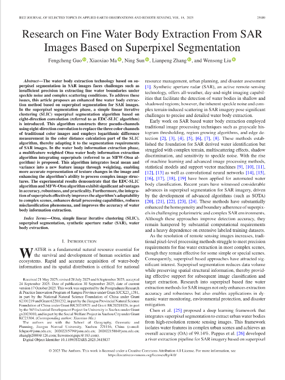 Abstract:The water body extraction technology based on superpixel segmentation in SAR images faces challenges such as insufficient precision in extracting fine water boundaries under speckle noise and complex scattering conditions. To address these issues, this article proposes an enhanced fine water body extraction method based on superpixel segmentation for SAR images. In the superpixel segmentation phase, a simple linear iterative clustering (SLIC) superpixel segmentation algorithm based on eight-direction convolution (referred to as EDC-SLIC algorithm) is introduced. This algorithm constructs three pseudo-channels using eight-direction convolution to replace the three color channels of traditional color images and employs logarithmic difference measurement in the color distance calculation part of the SLIC algorithm, thereby adapting it to the segmentation requirements of SAR images. In the water body information extraction phase, a multifeature weighted Otsu water body information extraction algorithm integrating superpixels (referred to as MFW-Otsu algorithm) is proposed. This algorithm integrates local mean and variance into a new feature image through weighting, enabling more accurate representation of texture changes in the image and enhancing the algorithm’s ability to process complex image structures. The experimental results demonstrate that the EDC-SLIC algorithm and MFW-Otsu algorithm exhibit significant advantages in accuracy, robustness, and practicality. Furthermore, the integration of superpixels effectively improves the algorithm’s adaptability to complex scenes, enhances detail processing capabilities, reduces misclassification phenomena, and improves the accuracy of water body information extraction.