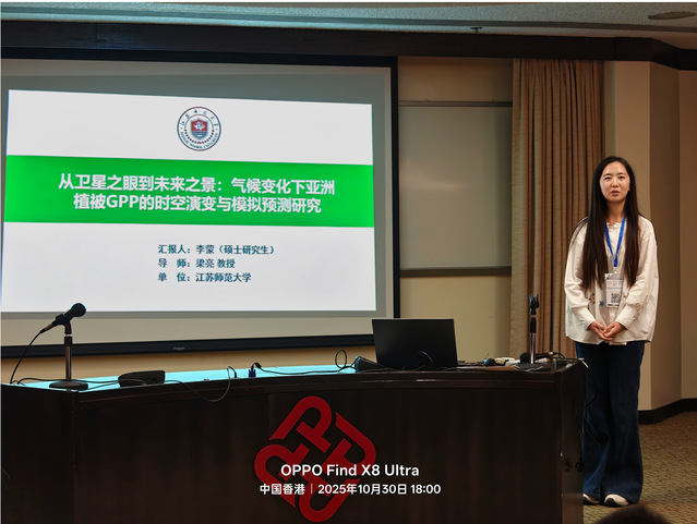 在大会报告环节,梁亮教授作为特邀嘉宾,作了题为《陆地生态系统净初级生产力遥感估算与时空动态分析》的学术报告,系统展示了我院在生态系统碳循环遥感监测领域的最新成果,报告引发了与会专家的广泛关注与热烈讨论,进一步提升了我院在该领域的学术影响力。梁亮教授指导的硕士研究生李蒙在研究生分论坛上汇报了题为《从卫星之眼到未来之景:气候变化下亚洲植被GPP的时空演变与模拟预测》的研究进展。该报告逻辑清晰、方法创新、结论具有启发性,展现出我院学子扎实的专业基础与良好的科研潜力,获得评审专家一致好评。经论坛评审委员会严格遴选,在来自两岸三地高校的硕博研究生中共评选出3项“优秀学术报告奖”,李蒙同学脱颖而出,成功获此荣誉。