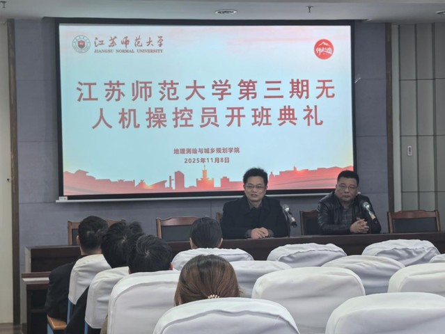 2025年11月8日,江苏师范大学第三期无人机操控员培训开班典礼在静远楼1307会议室隆重举行。地理测绘与城乡规划学院副院长梁亮、江苏师范大学职业技能鉴定中心主任姚建及相关负责老师齐聚一堂,共启无人机技能学习新篇章。