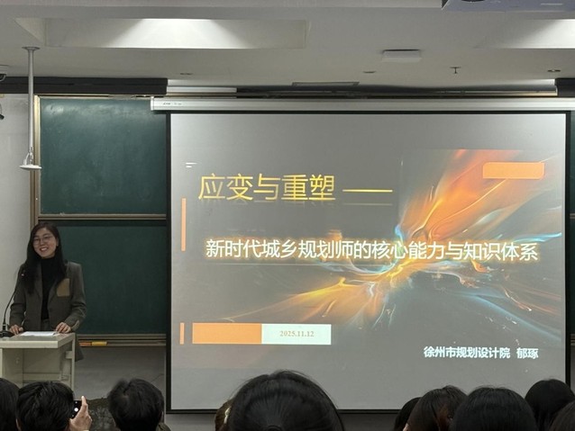 2025年11月12日14:00,徐州市规划设计院副院长(副经理)郁琢规划师应邀在8号楼J103报告厅开展了主题为《应变与重塑——新时代城乡规划师核心能力与知识体系》的学术报告。该讲座由杨国霞副教授主持,我院城乡规划专业师生听取了本次报告。