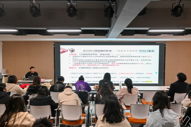 讲座伊始,潘永亮老师首先聚焦高校学生干部的心理素质要求,系统梳理了国家层面关于心理健康的相关法规文件,明确了校园心理健康工作的核心导向。他结合学生干部学业与工作兼顾的现实困境,详细解读了世界卫生组织提出的四维健康概念,并引用相关数据介绍了当前大学生心理健康的现状,帮助学生干部建立科学、全面的心理健康认知。随后,潘永亮老师围绕大学生心理问题的成因与应对措施,通过典型案例剖析心理问题的核心诱因,结合科学实验阐释压力过载对个体的影响。针对学生干部面临的双重压力,现场开展了压力诊断互动环节,传授压力管理三部曲,指导学生通过自我检测、情绪调节等方式实现有效心理自助。最后,潘老师针对学生干部心理助人能力的培养,系统介绍了心理危机的发生发展规律,指导学生识别危机关键信号。他强调,学生干部应掌握望闻问切式观察方法,以真诚倾听和情绪支持为核心,在必要时及时转介帮扶对象,充分依托校园心理支持网络,形成心理育人合力。