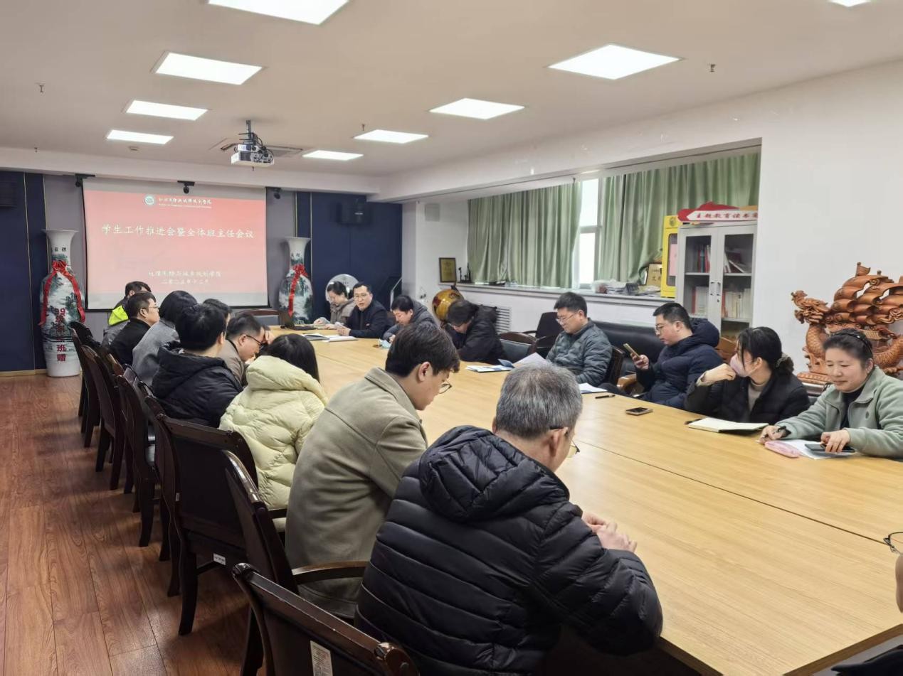 赵玉璋首先对本学期的学生思想政治引领、学风建设、日常管理、心理健康教育、资助育人等方面工作进行了情况通报与总结。随后,结合学校相关要求,对本学期末和寒假期间的重点任务进行全面部署。全体班主任需落实五项核心任务:一是严抓考风考纪,筑牢诚信教育防线,通过案例警示、主题班会等形式强化学生诚信考试意识,营造公平公正的考试环境;二是全面开展安全教育,强化学生安全意识,重点开展防诈骗、饮食安全、消防安全及交通安全等专题教育,严格落实学生离校登记制度,严查违规电器使用,消除安全隐患;三是聚焦重点群体,实施精准帮扶,同时加强心理日常观察,做到风险早发现、早干预;四是深化班级管理,压实主体责任,深入学生群体,精准掌握学生动态,异常情况要及时发现,及时上报;五是注重工作衔接,确保闭环落实,明确班主任需结合前期经验提前谋划下学期班级工作,重点做好返校统计以及开学初适应性教育等环节衔接,确保各项工作有序推进。