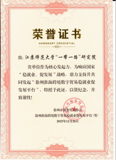12月26日下午,在徐州市服务贸易协会2025年度年会上,由江苏师范大学“一带一路”研究院联合徐州市服务贸易协会、徐州市劳动和社会保障学会等多家单位共同发起的“徐州淮海跨境数字贸易稳就业促发展平台”正式启动筹建。这一平台的搭建,精准响应国家“一带一路”倡议与“稳就业、促发展”战略部署,聚焦淮海经济区跨境数字贸易产业发展痛点,构建“政产学研用”协同创新生态,为徐州建设淮海经济区中心城市、推动开放型经济高质量发展注入新动能。