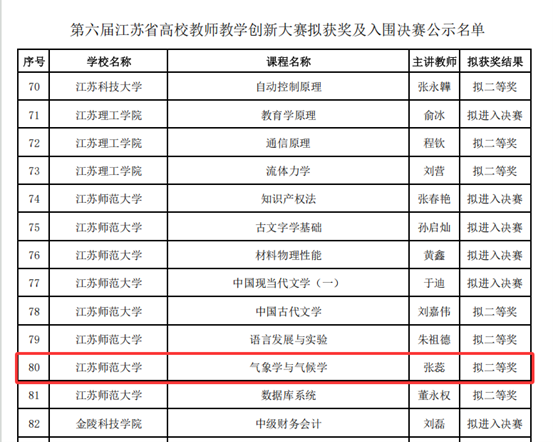 大赛以“推动教学创新、培养一流人才”为主题,全省75所高校报送了643项作品参赛,经过网络评审、组委会评定层层选拔,共有307项作品拟获奖项,其中拟入围决赛作品161项、拟获二等奖作品146项。张蕊老师以主讲的《气象学与气候学》课程参赛,通过逻辑缜密的创新报告和沉浸互动的课堂实录,展示了“探究-释因-拓界-创生”生成式四阶教学创新模式,其新颖的实施路径和显著的应用价值赢得了评委的高度认可。